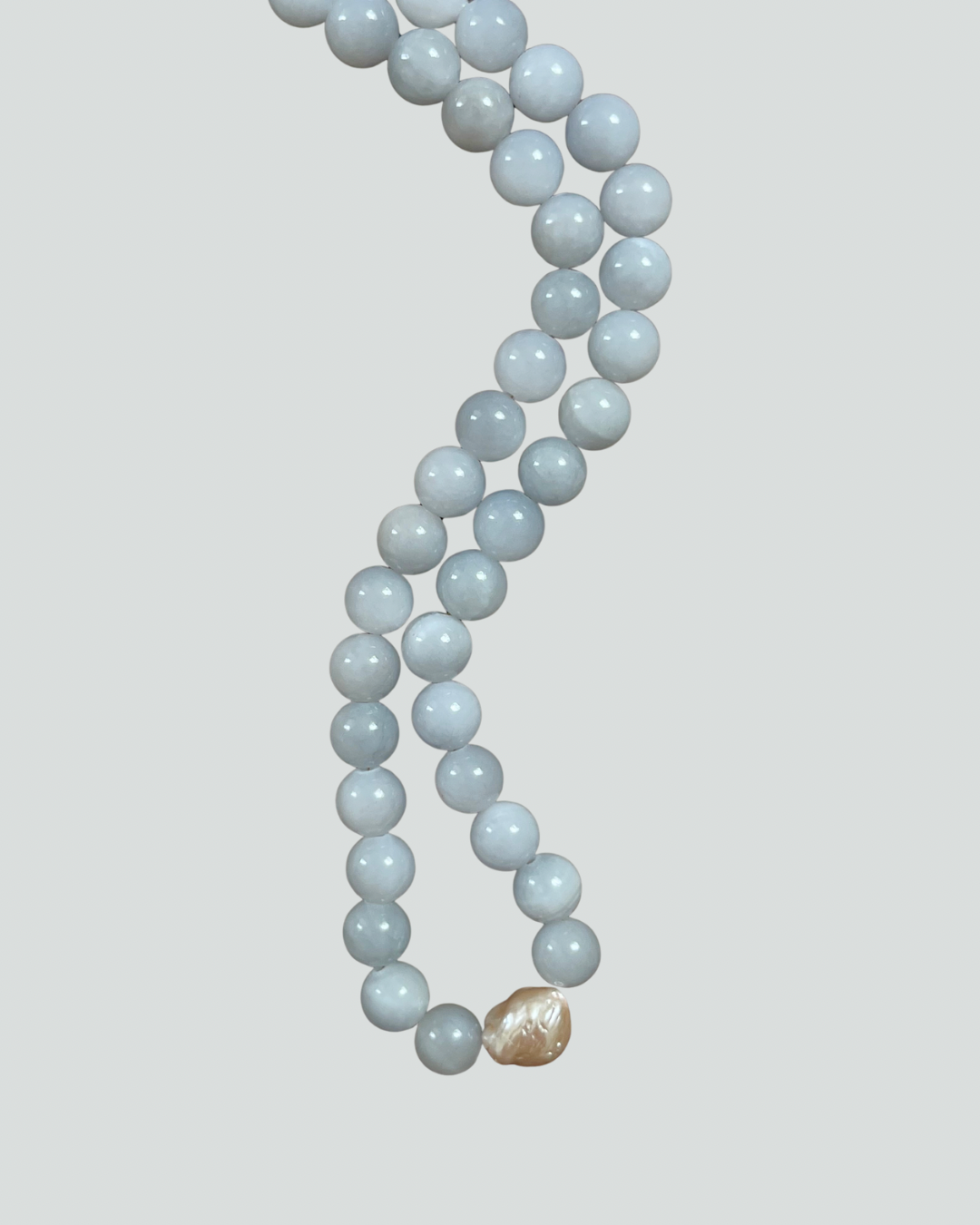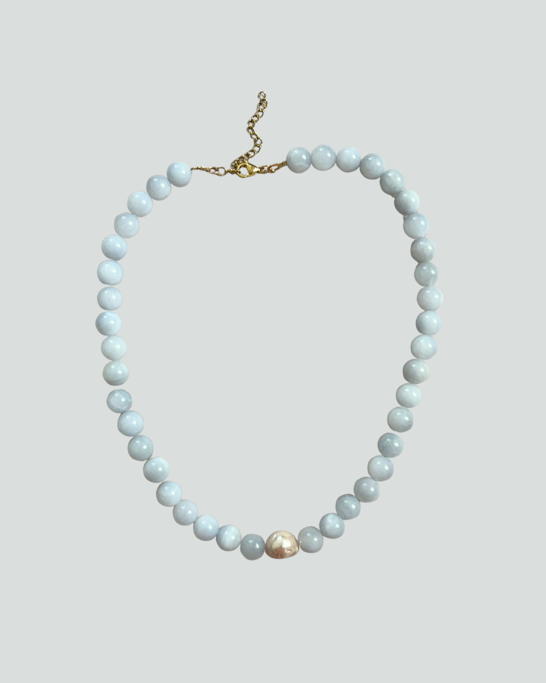 This light blue-hued piece features glossy beads and a sculptural pearl accent, like a drop of light nestled. Feminine, grounding, and playful — a touch of soft rebellion.