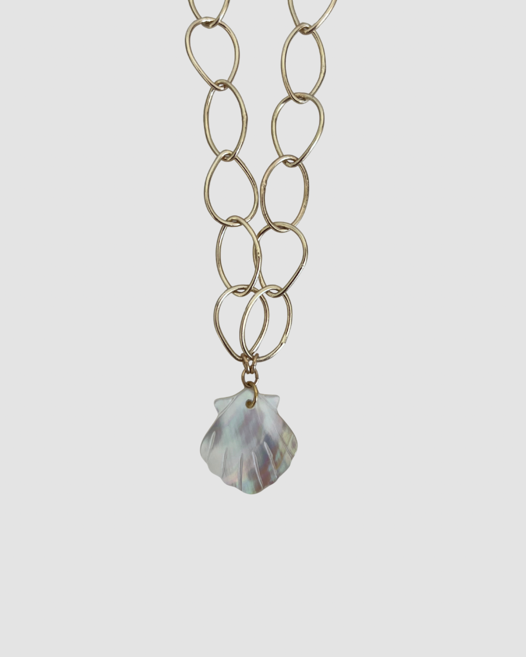 Una concha tornasolada, como joya sagrada traída por la marea nocturna.
