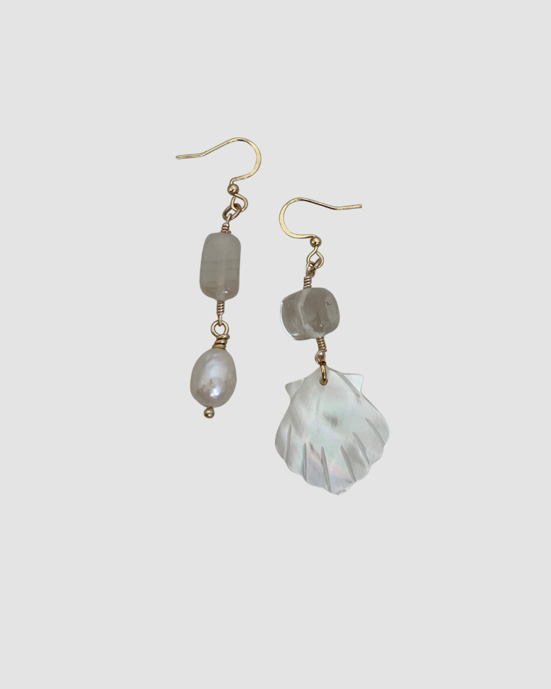 Aretes asimétricos con piedra, perla y concha madreperla.
