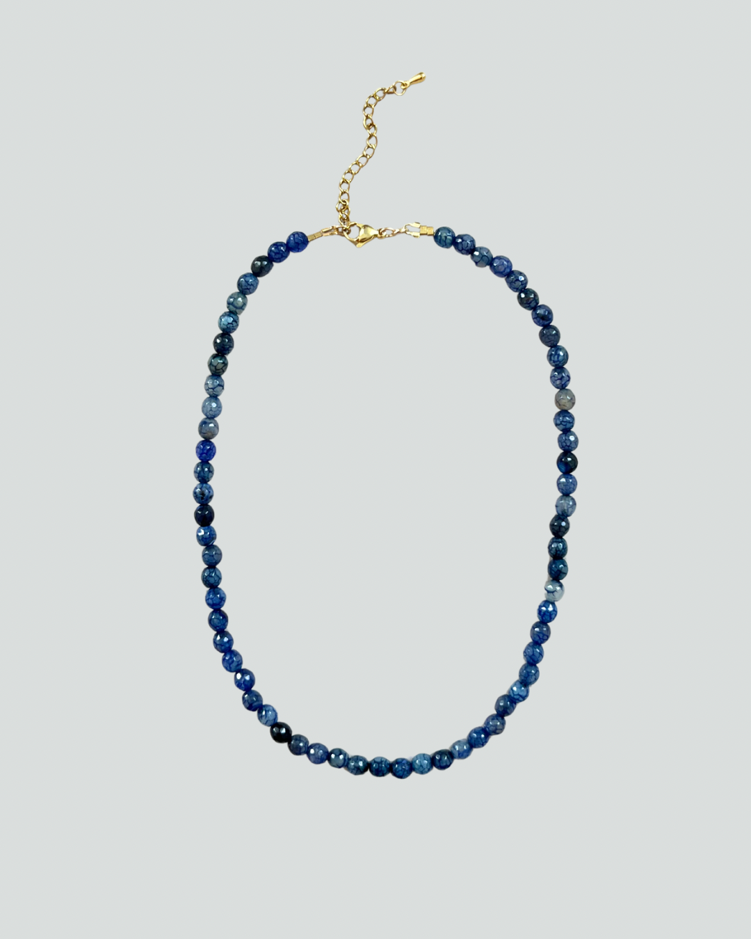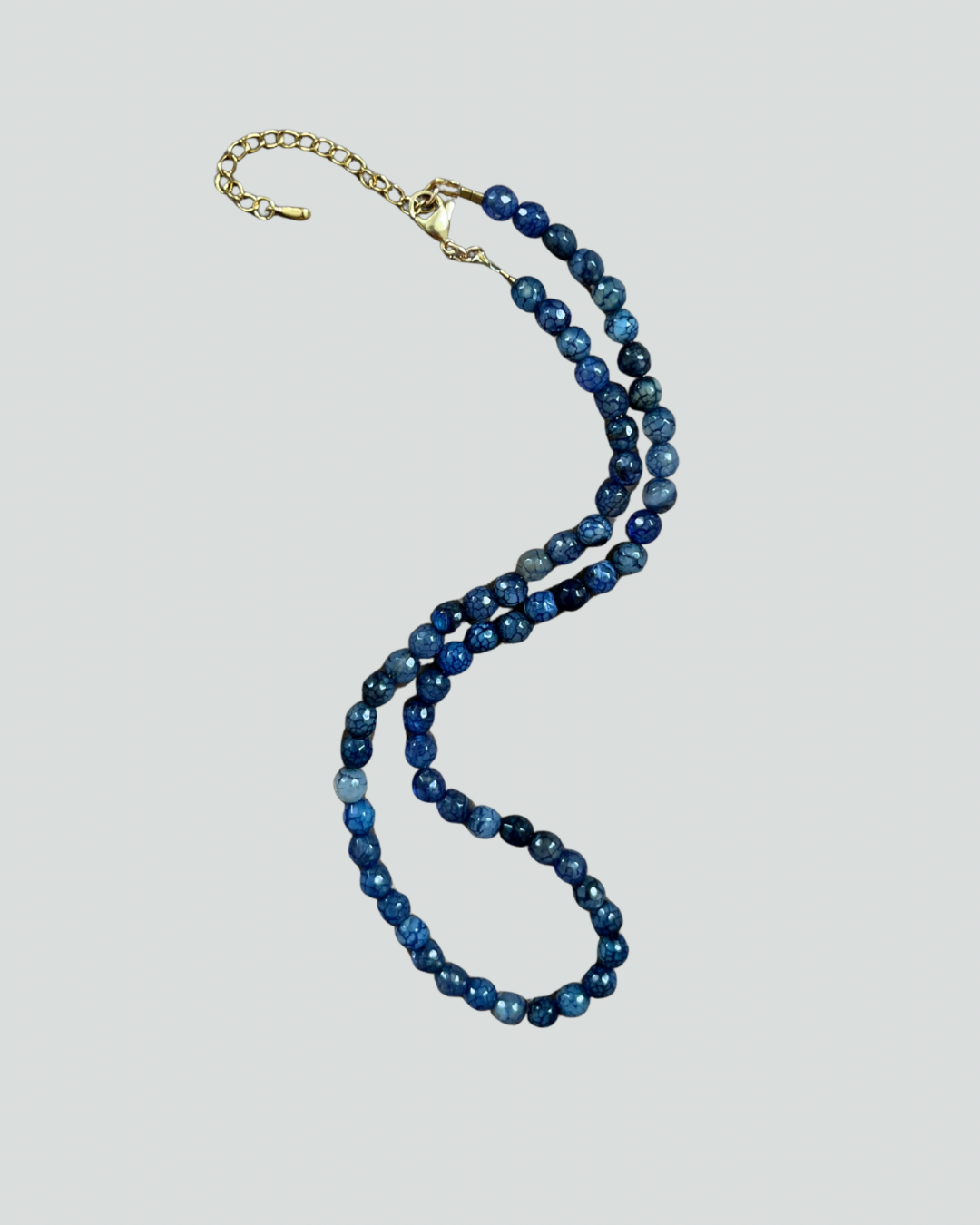 A moody blend of deep blue hues strung like stars across the neck. Each bead shifts subtly in tone — from twilight to ink — creating a galaxy of blues. Finished with a gold clasp and extender for easy layering.