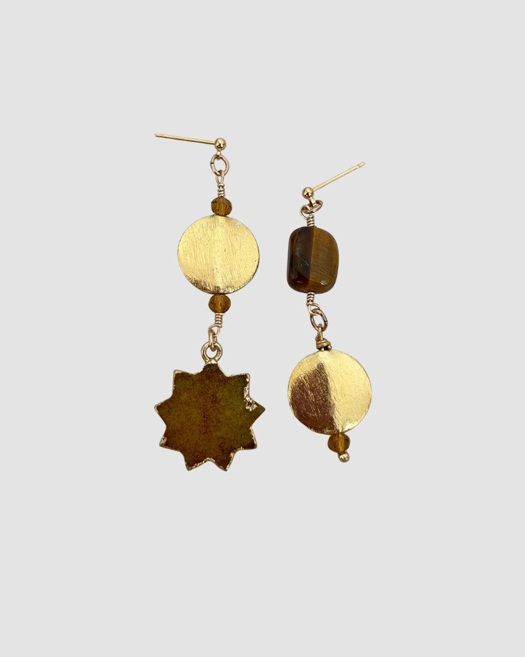 Aretes asimétricos con discos dorados, estrella y ojo de tigre.