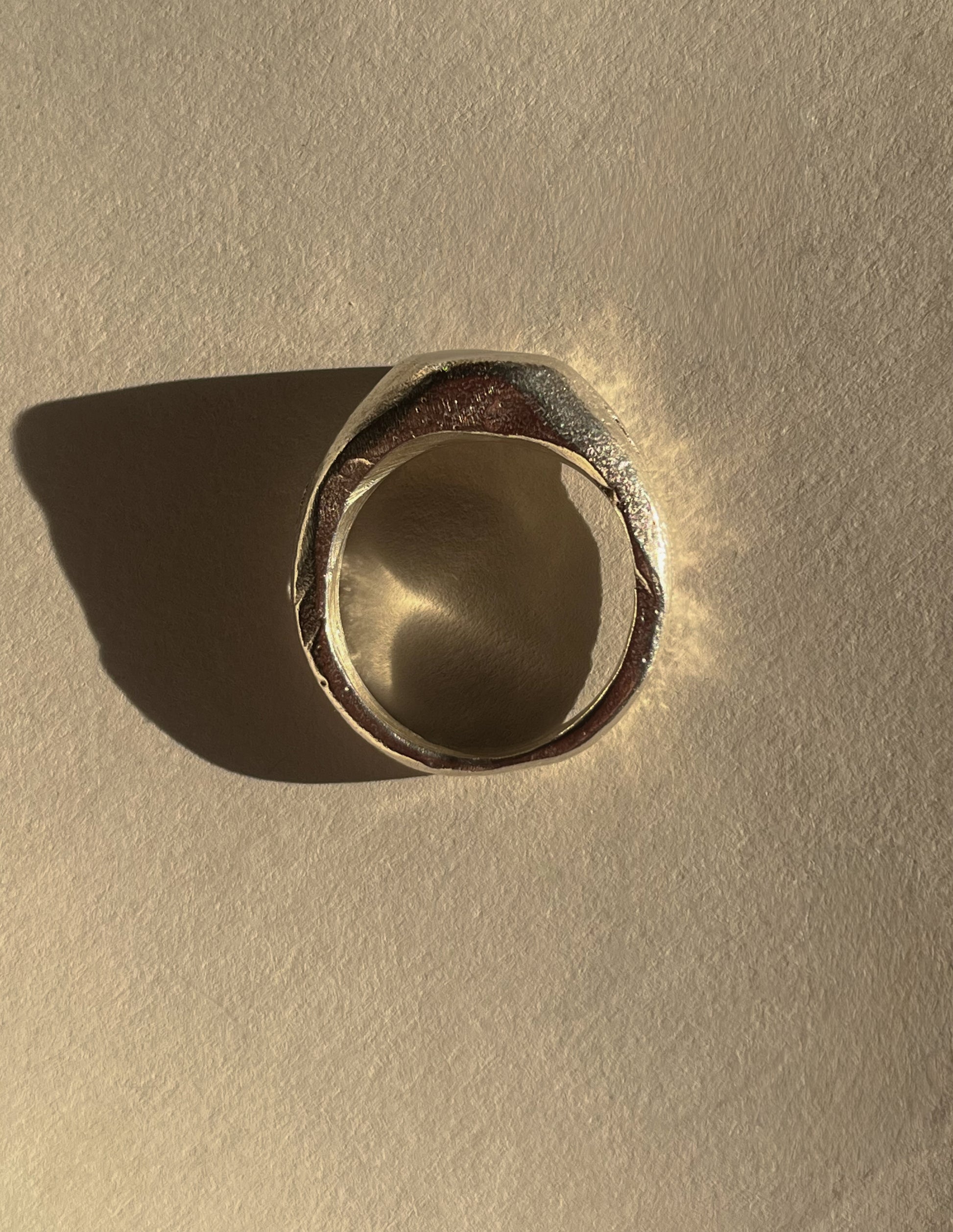 The Signet Ring is cast in sterling silver and shaped by hand to achieve its architectural profile. Its squared top edge softens into rounded inner curves, creating a piece that is both structured and comfortable for everyday wear. Each ring is refined through slow filing, smoothing, and hand-polishing, leaving subtle traces of the making process in the surface—unique to every piece.