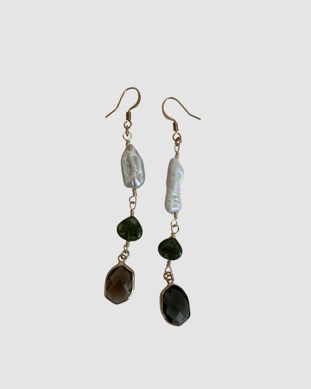 Aretes con perla barroca, verde oliva y cuarzo ahumado