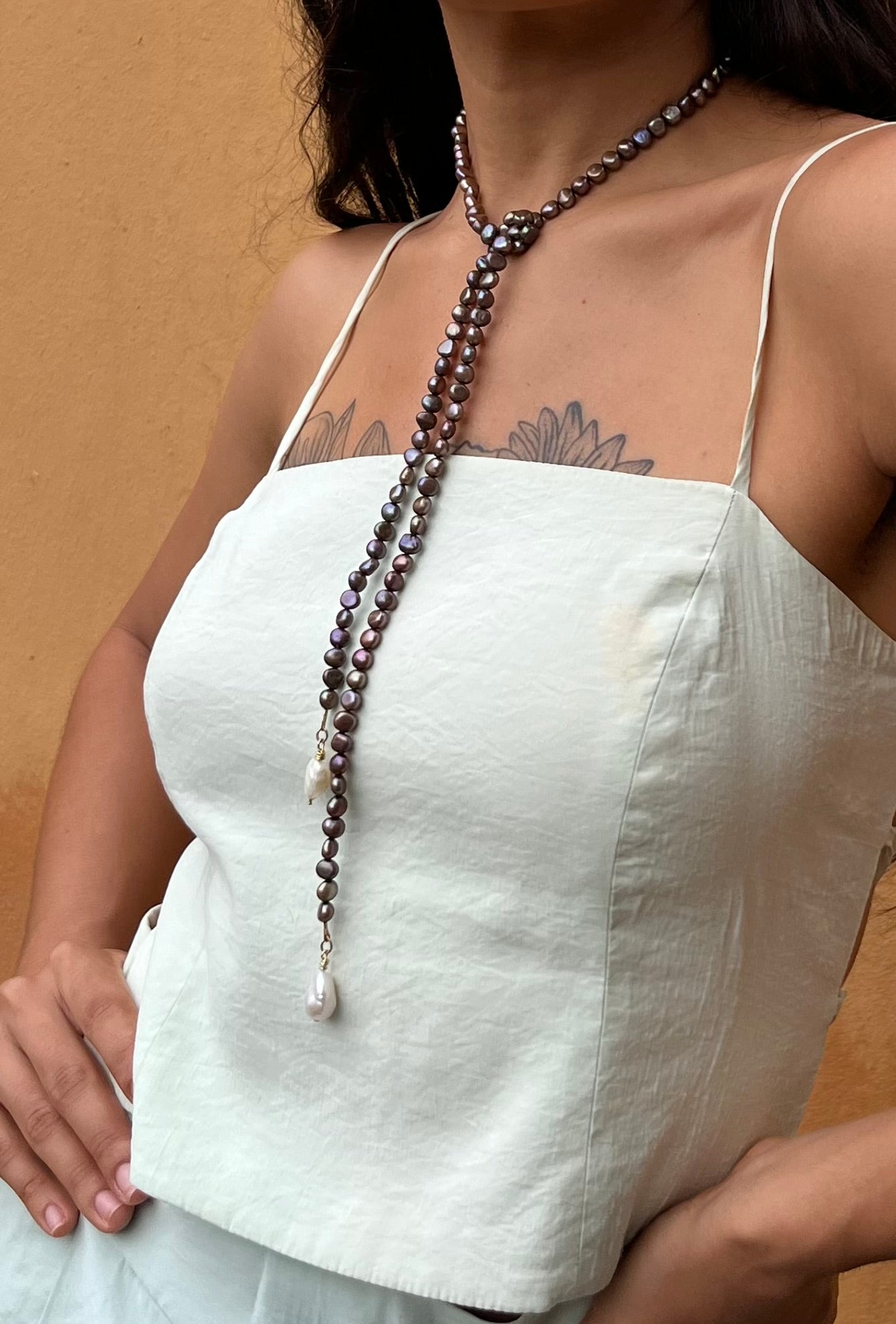 Like a river gliding beneath moonlight, the Río Silente Necklace captures a quiet, fluid elegance. Made with hand-knotted, dark freshwater pearls that shimmer with iridescent depth, this piece is finished with two luminous baroque pearls — each one a natural relic, shaped by time.